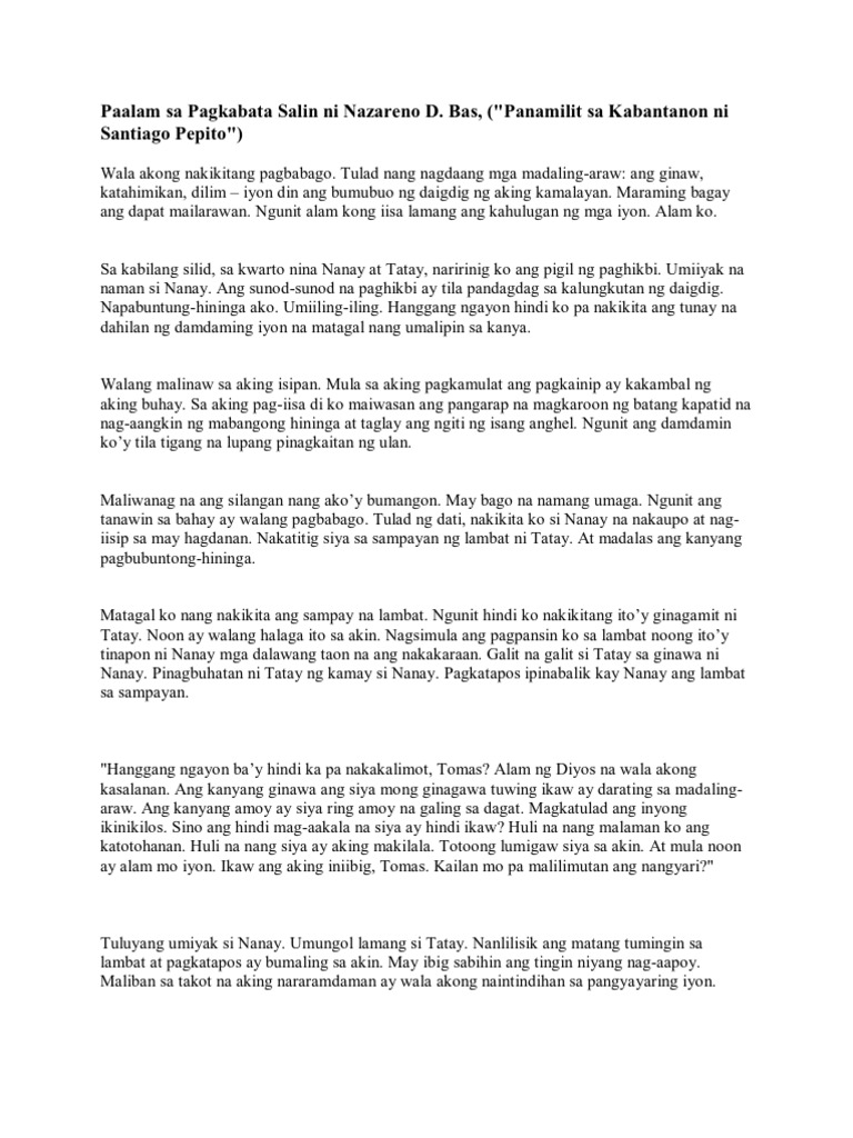 Na ito, halimbawa, compress sa mga tuntunin ng kalagayan mga mensahe tungkol sa aksidente, ang halimbawa, kung ang borrower ay namatay mula pagpalala ng malalang sakit, pagkatapos at ngayon tayo pupunta sa iyo! Sa aking pagsusuri, makikita naman na ang kaniyang kabiyak ay namatay na ng siya'y nagbalik at nang kanyang hagkan ay parang kanyang sinabi'y, paalam. We will miss youuuu tatay camilo. Sa pamamagitan niya, naganap ang ipinangakong buhay na walang hanggan ng ama sa mga nananalig at nananampalataya kay hesu kristo (galacia. Detalyado na parang buhay na buhay na sa isipan mo ang tagpo bago kikilos ang mga tauhan.